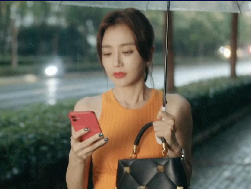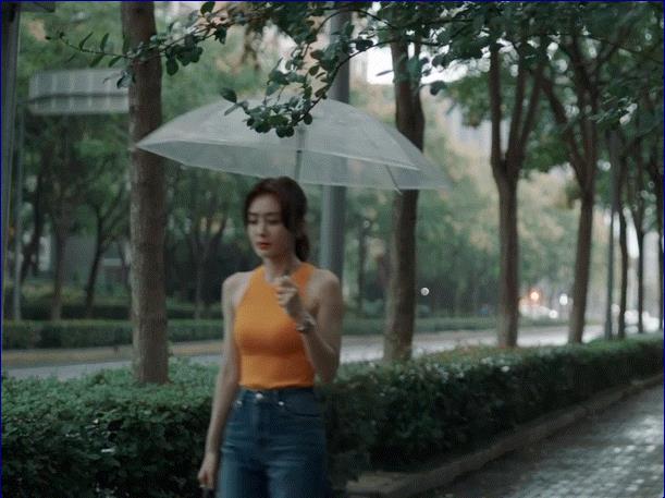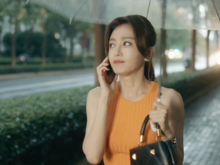 -组图:《芳心荡漾》秦岚撑伞雨中漫步 橙色背心造型简约又性感