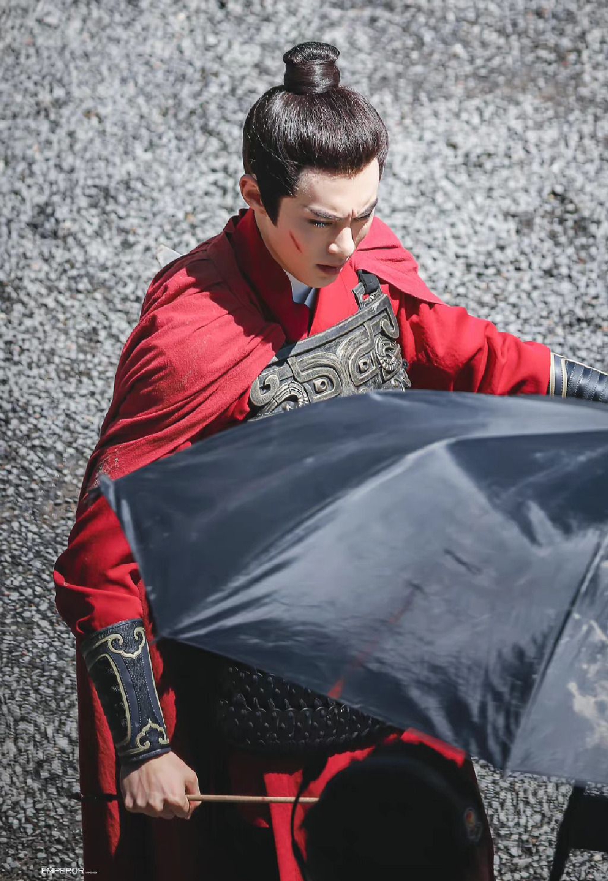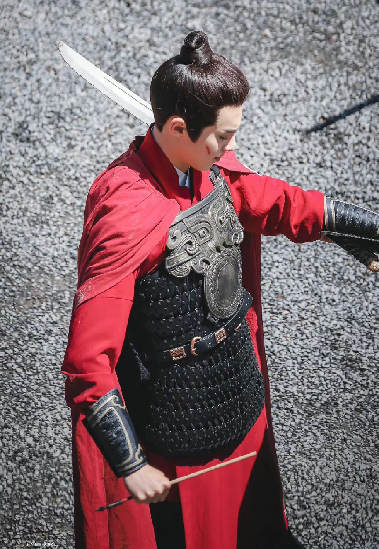 组图:王鹤棣《浮图缘》饭拍路透 红衣铠甲战损妆帅气十足
