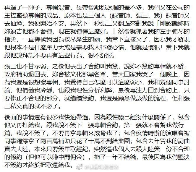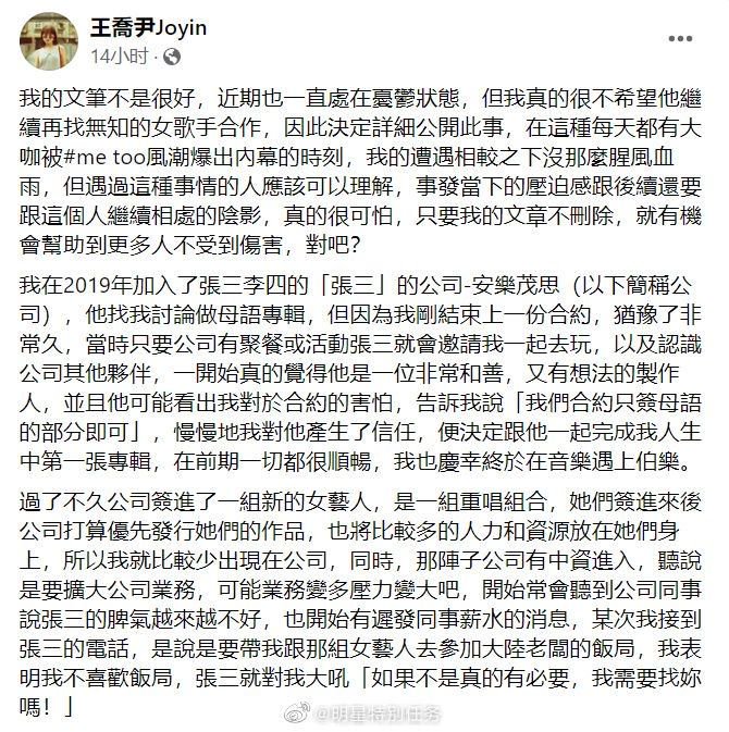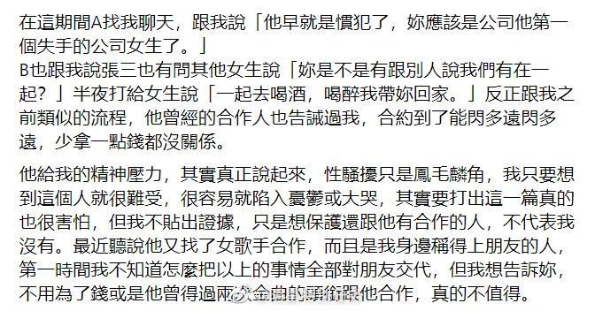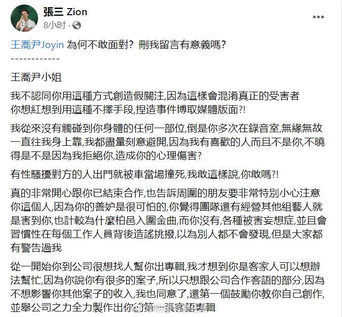 曾以团体“张三李四”拿下金曲奖的歌手张三22日遭歌手王乔尹发长文指控性骚扰,透露当时张三趁四下无人把手伸进衣服,并且在工作上给予不断刁难跟谩骂。对此,张三在严正抗议,反过来控诉对方自己贴上来,甚至发毒誓:有性骚扰对方的人出门就被车当场撞死。