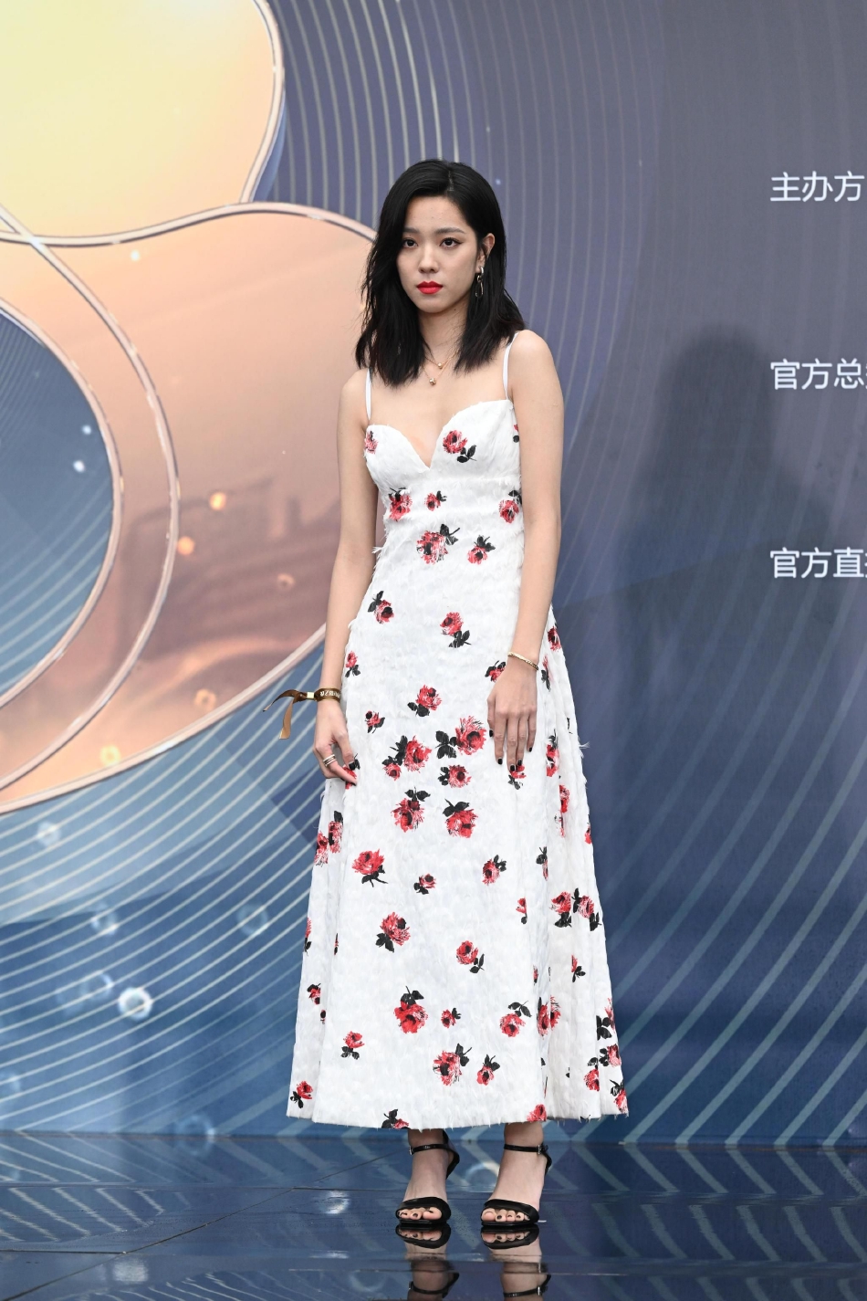 组图:庄达菲亮相2022微博电影之夜 穿羽毛花朵印花礼服复古甜美