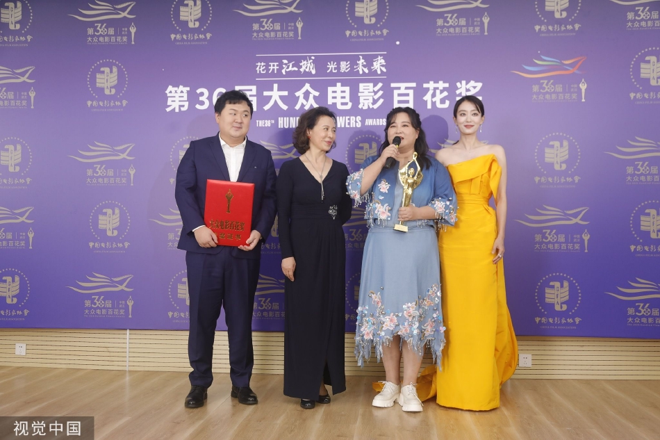 -组图:《李焕英》剧组捧奖杯 张小斐黄裙显肤白气质佳